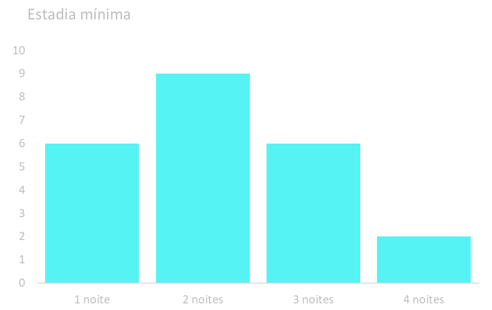 No que diz respeito à política tarifária, 6,62% das propriedades não cobram taxa de limpeza, e 9,56% não aplicam cobrança extra por hóspede adicional – um diferencial que pode atrair reservas em grupo. Quanto à flexibilidade de estadia, a maioria permite períodos curtos: 6 propriedades aceitam reservas de apenas 1 noite, 9 de 2 noites, 6 de 3 noites e 2 de 4 noites.